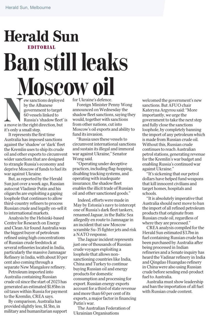 Kateryna Argyrou, AFUO Chair, quoted in “Australia’s military links to illegal Russian oil”, Australian Financial Review, 23 October 2025