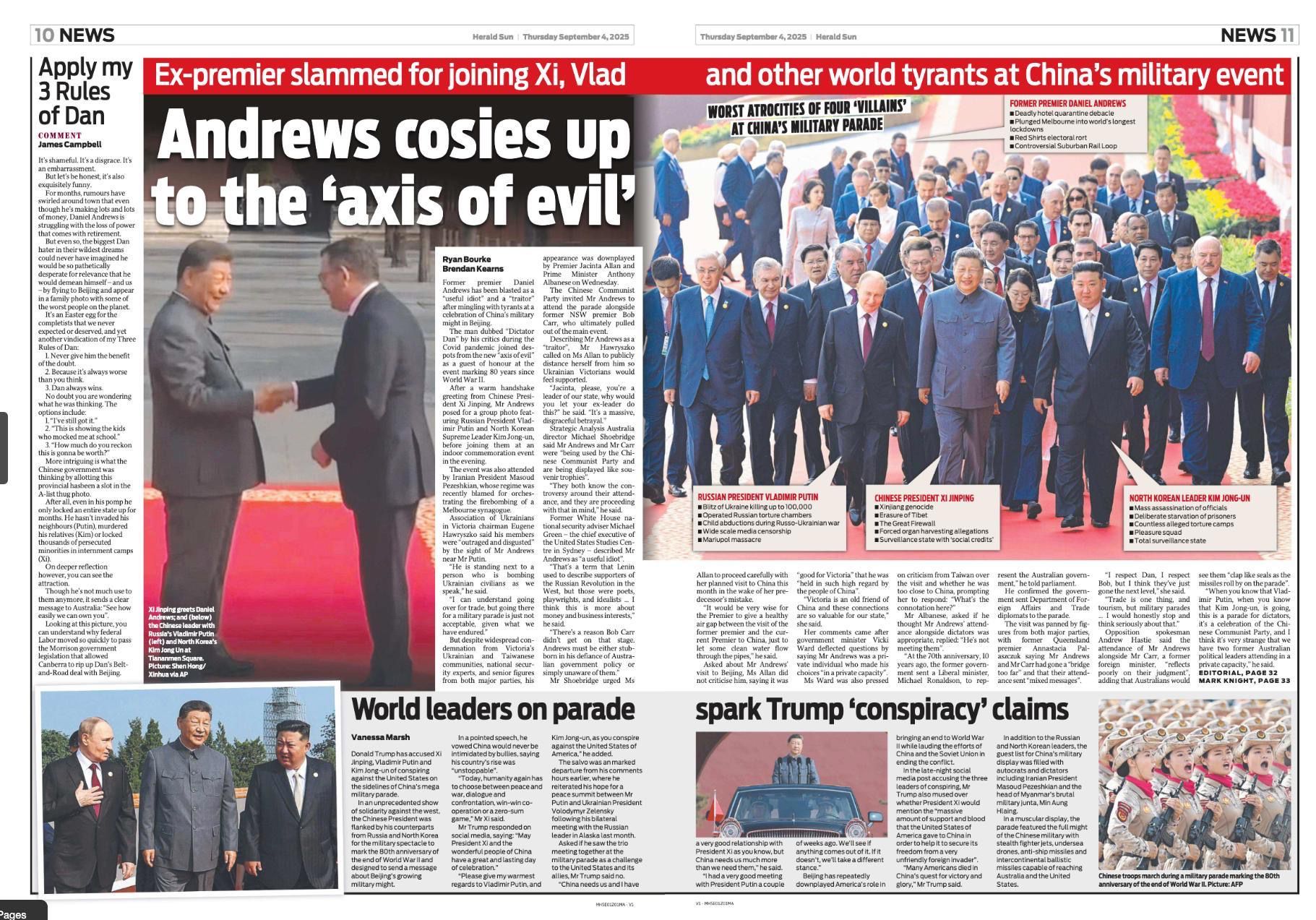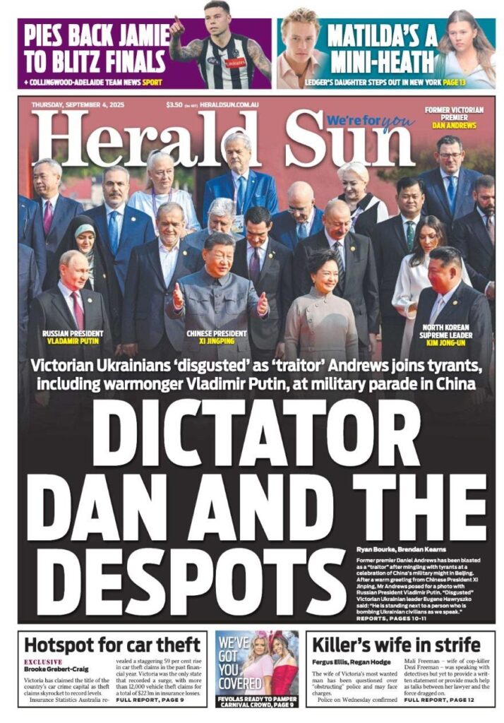 Former Victorian Premier Dan Andrews cosies up to the axis of evil, Herald Sun, 4 September 2025 | cover, main article