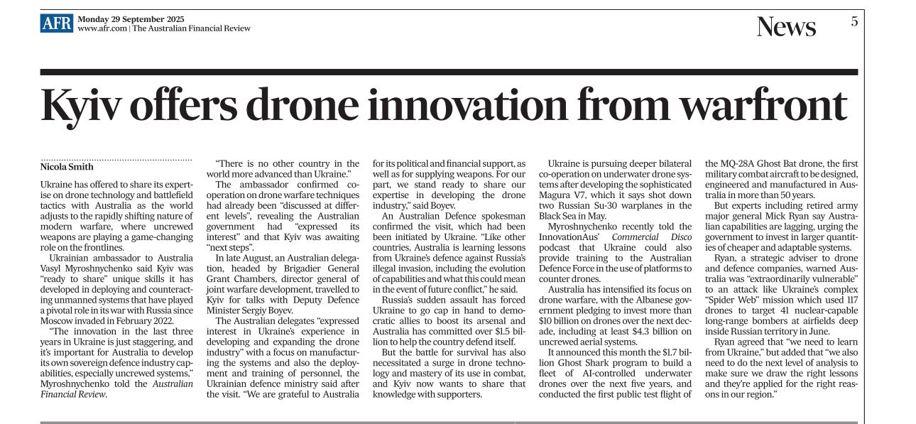 Ukrainian ambassador wants Australian technology tested on front lines, Sam Jones, Business News, 7 October 2025