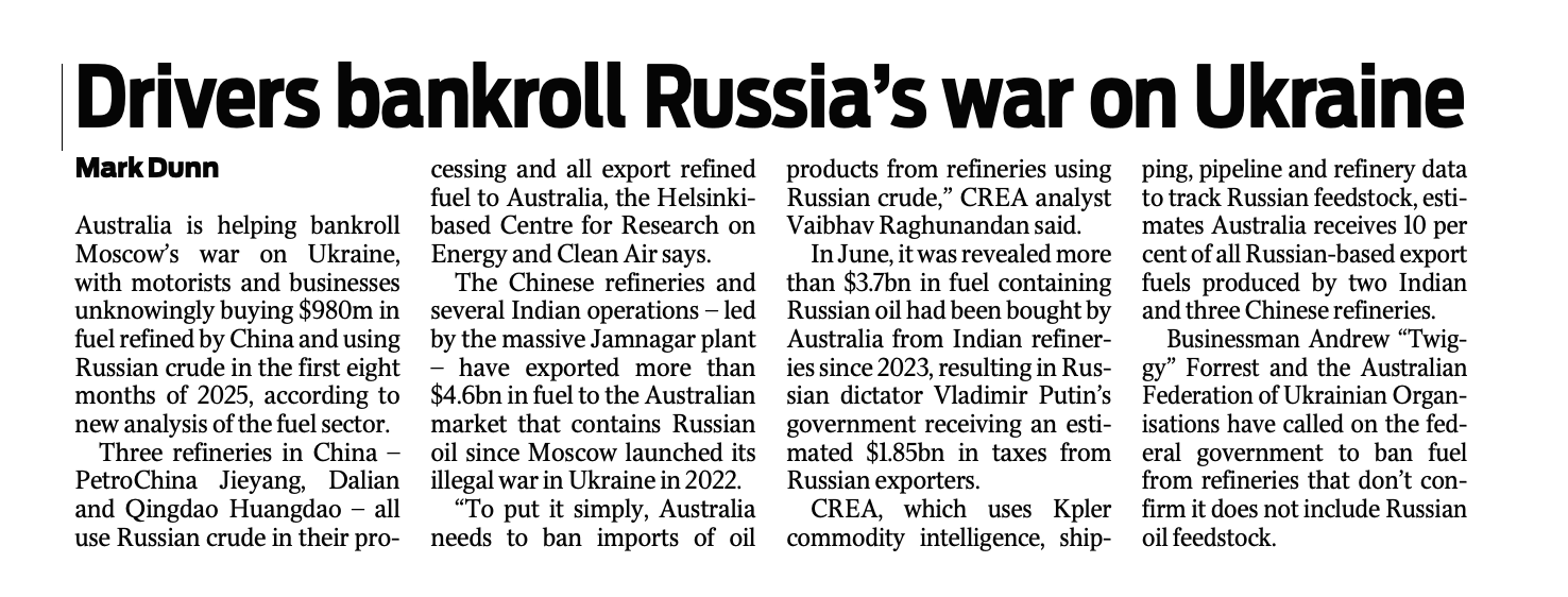 Opinion: My Ukrainian neighbours have fuelled my campaign to block Russian oil from Australia By Mark Corrigan, Sydney Morning Herald/The Age, 21 November 2025